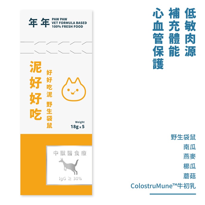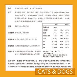 成分:野生袋鼠、南瓜、燕麥、櫛瓜、蘑菇、昆布、芥花油、干貝、Leiber@Brewers’Yeast、MEG-3®魚油、ColostruMuneTH牛初乳、甘蔗纖維、卵磷脂、蒟蒻粉、碳酸鈣酵母硒、綜合礦物質(鈣,鎂,磷,鉀,鐵,鈉,鋅,銅,碘)、綜合維生素(A, D, E, C, B1, B2, B3, B5, B6, B7, B9, B12)、牛磺酸