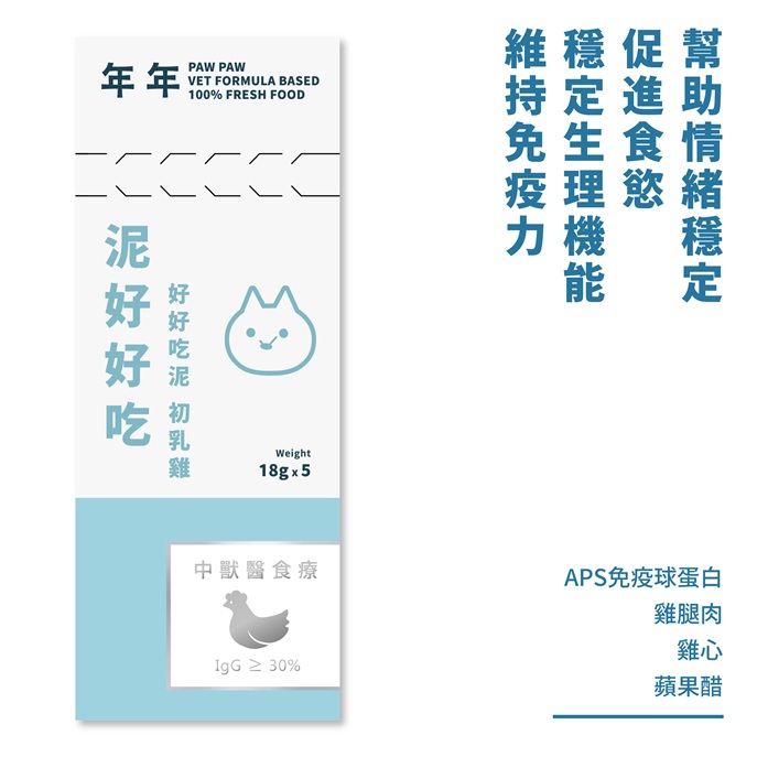 成分:雞胸肉、雞肝、APS初乳蛋白、雞心、雞油、葵花籽粉、蛤蠣、滴雞精、綜合維生素(A, D, E, C, B1, B2, B3, B5, B6, B7, B9, B12)、綜合礦物質(鈣,鎂,磷,鉀,鐵,鈉,鋅,銅,碘)、胡蘿蔔、甘蔗纖維、海藻鈣、菠菜、昆布、蘋果醋、牛磺酸、寒天、木天蓼