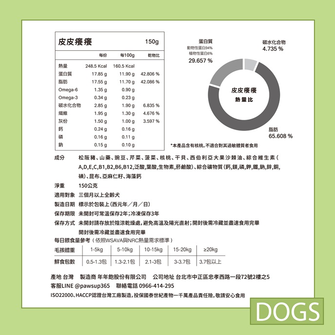 成分:松阪豬肉/山藥/豌豆/芹菜/菠菜/核桃/干貝/西伯利亞大果沙棘油/綜合維生素(A,D,E,C,B1,B2,B6,B12,泛酸,葉酸,生物素,菸鹼酸)/綜合礦物質(鈣,鎂,磷,鉀,鐵,鈉,鋅,銅,碘)/昆布/亞麻仁籽/海藻鈣